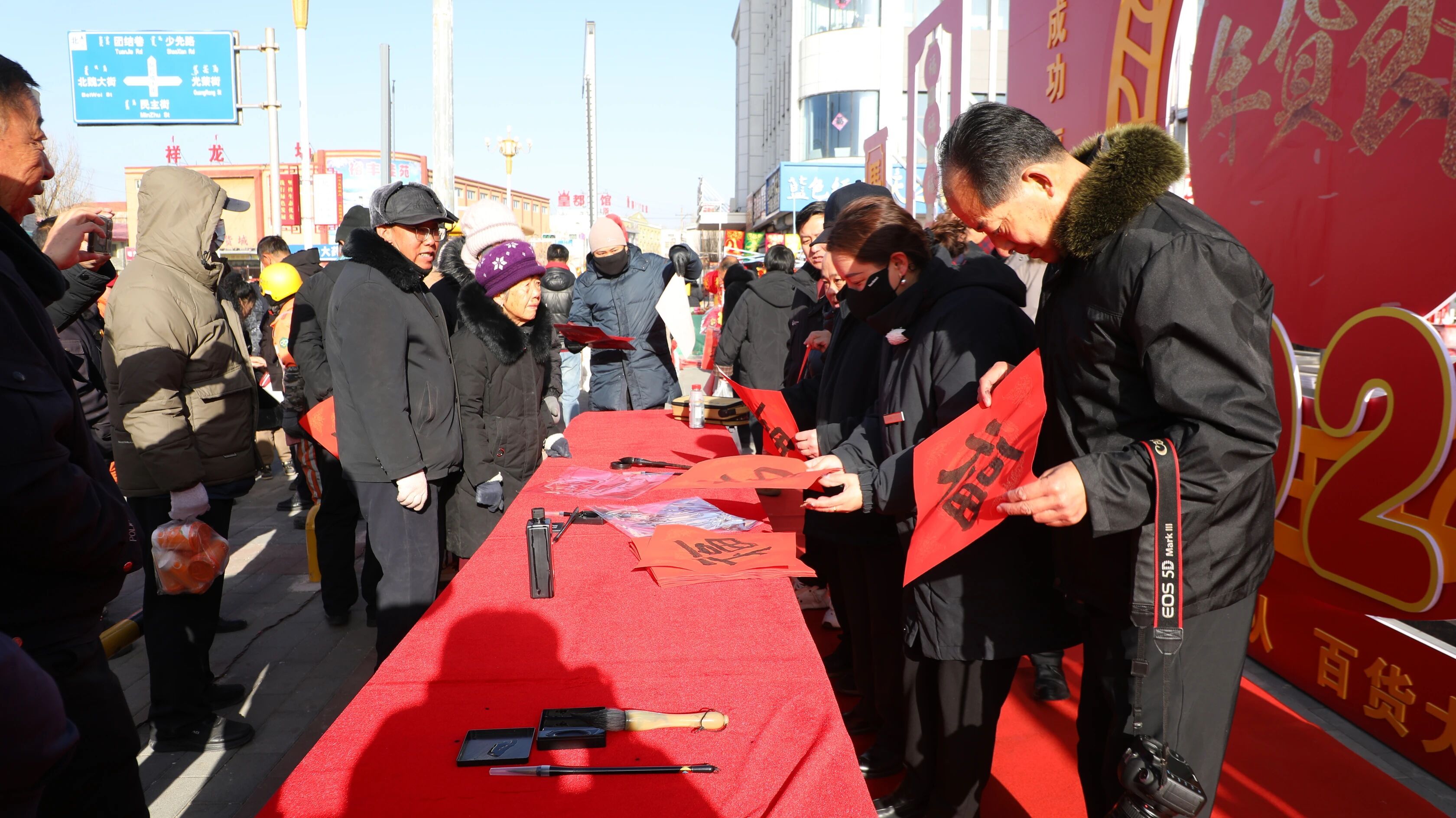 为绘就民生暖心画卷,县文联、县文旅局、县城管大队携手百货大楼、金山悦府等企业共同发力。活动现场,“书法名家手写春联送福字”、经典歌曲连唱等文化活动精彩纷呈,吸引众多市民驻足欣赏,深厚的文化底蕴与蓬勃的消费活力相交融,实现了文化惠民与市场繁荣的双向促进。“一直喜欢这墨香里的传统年味,今年领到了春联和福字,春节就能贴上啦!”张阿姨开心地说道。
