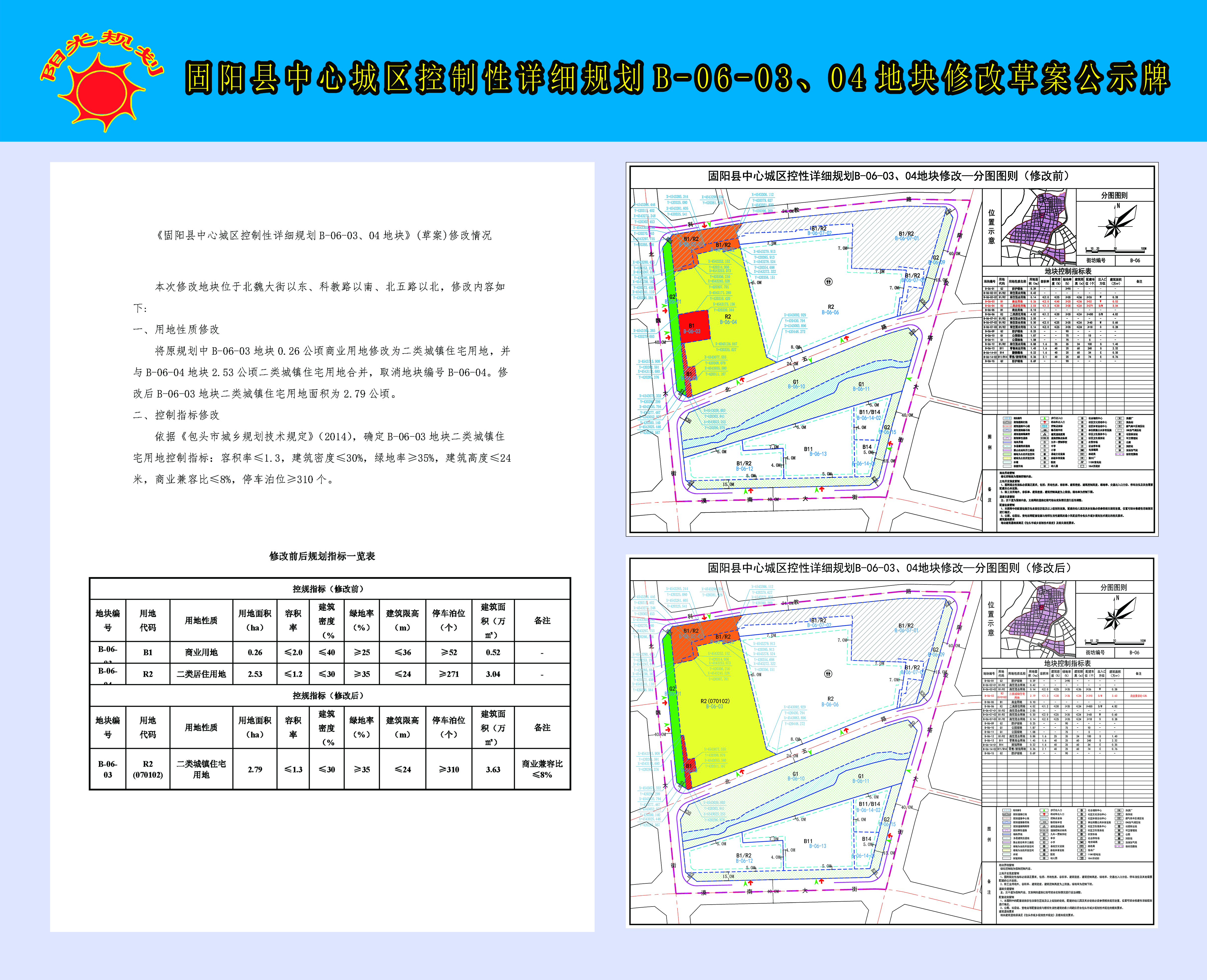 按照工作安排,我局组织编制了《固阳县中心城区控制性详细规划B-06-03、04地块修改专题报告及修改方案》(草案)。依照《中华人民共和国城乡规划法》第二十六条、《城市、镇控制性详细规划编制审批办法》第十二条的有关规定,为广泛听取群众意见,做到公平、公开、公正,现对《固阳县中心城区控制性详细规划B-06-03、04地块修改专题报告及修改方案》(草案)向社会公告,如有异议,可在公示之日起三十日内向固阳县自然资源局提出。