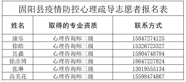 为有效避免疫情管控期间全县广大群众出现的焦虑、恐慌、紧张、烦躁等负面情绪,固阳县新时代文明实践中心通过招募心理援助志愿者,为广大群众、防疫人员、特殊困难老年人提供心理咨询、情绪疏导等心理辅导服务,请有需求的群众在9:00-12:00,14:30-18:00致电,我们将与您共克时艰、共同守护爱的家园。现将心理援助志愿者名单和服务热线公布如下: