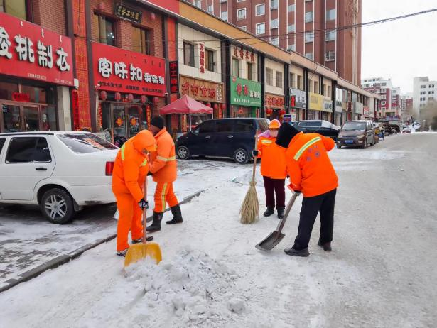 环卫工人们手拿着铁锹在寒风中一寸一寸铲冰除雪,他们坚守工作岗位清扫出一条条“暖心路”,最大程度地减少积雪对道路交通和居民安全出行带来的影响,为广大居民营造安全、洁净的出行环境。