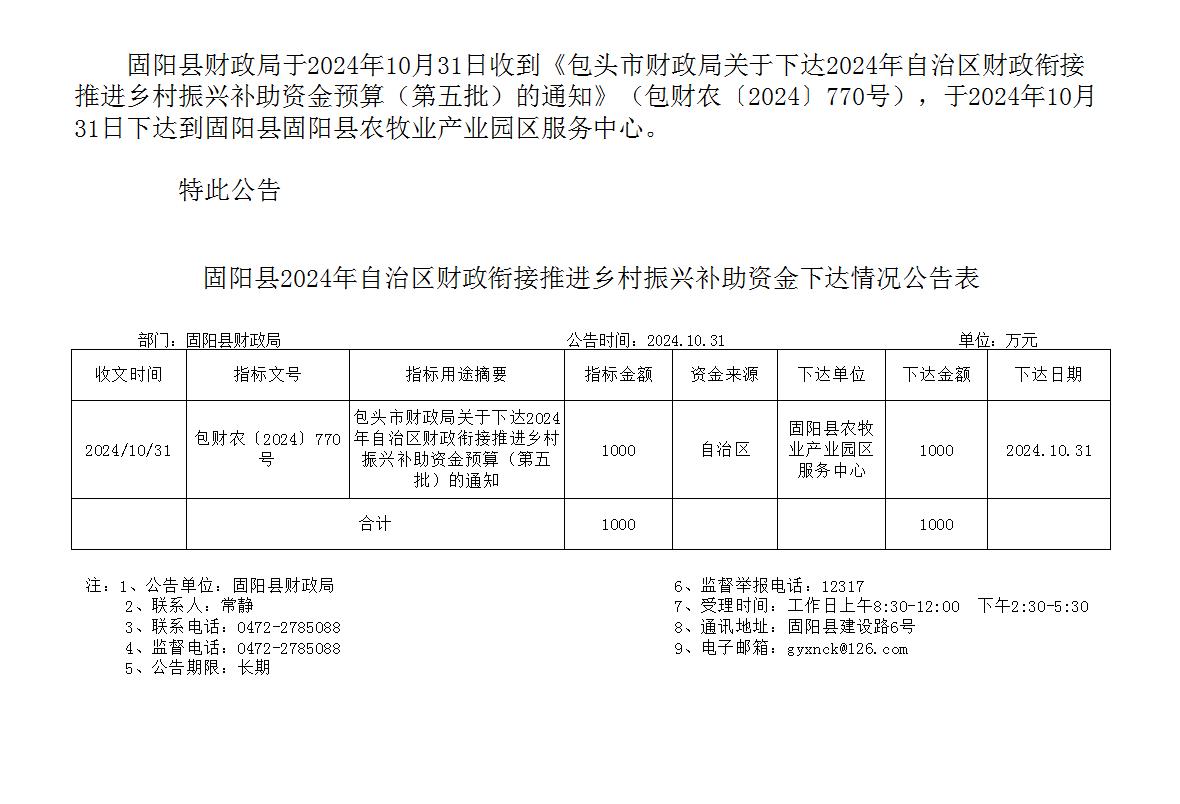固阳县2024年自治区财政衔接推进乡村振兴补助资金预算(第五批)下达情况公示