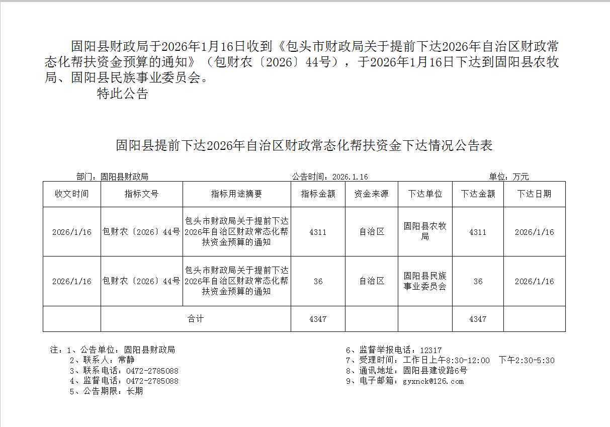 固阳县关于提前下达2026年自治区财政常态化帮扶资金下达情况公告