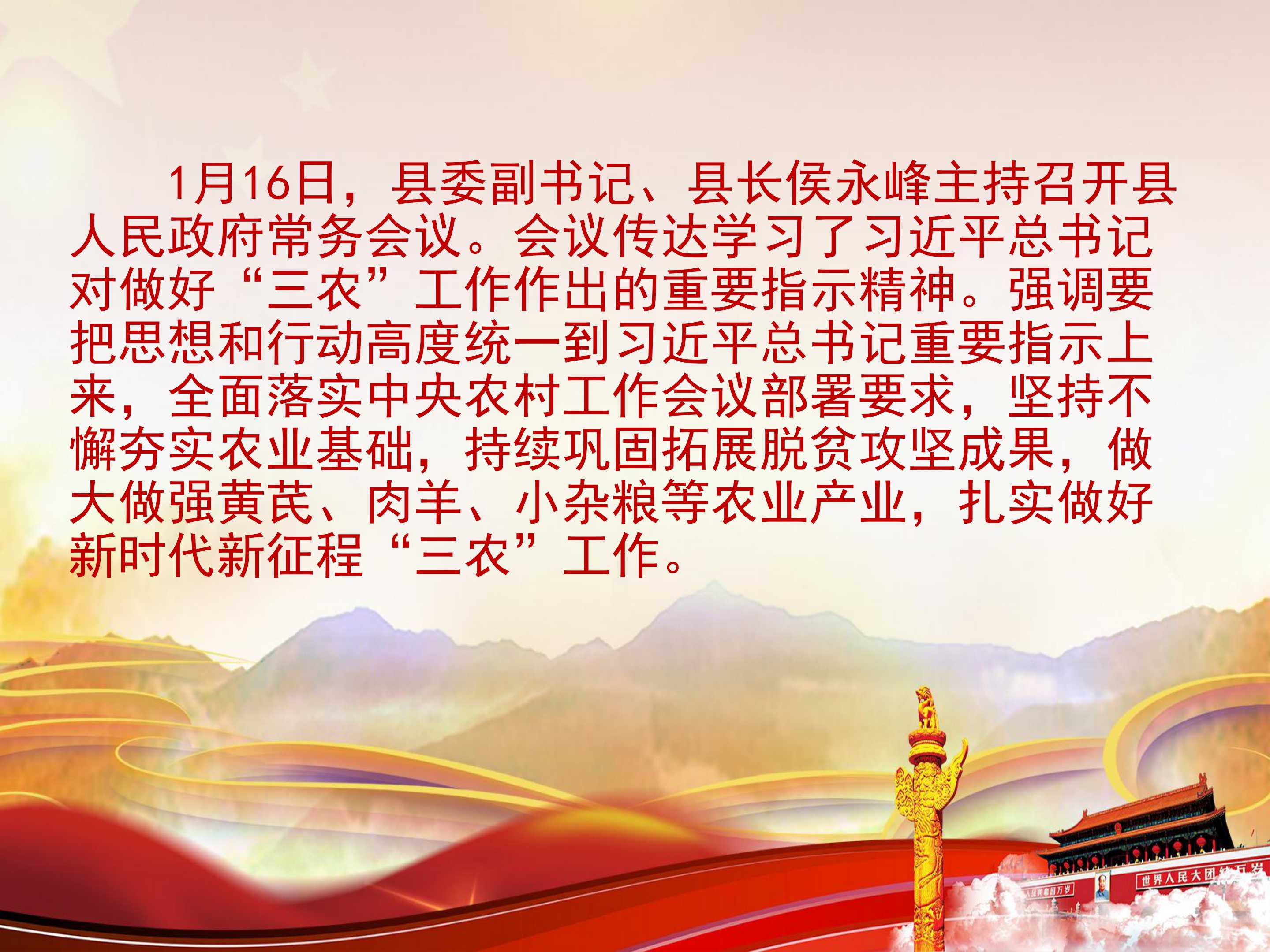 会议传达学习了习近平总书记对做好“三农”工作作出的重要指示精神。强调要把思想和行动高度统一到习近平总书记重要指示上来,全面落实中央农村工作会议部署要求,坚持不懈夯实农业基础,持续巩固拓展脱贫攻坚成果,做大做强黄芪、肉羊、小杂粮等农业产业,扎实做好新时代新征程“三农”工作。