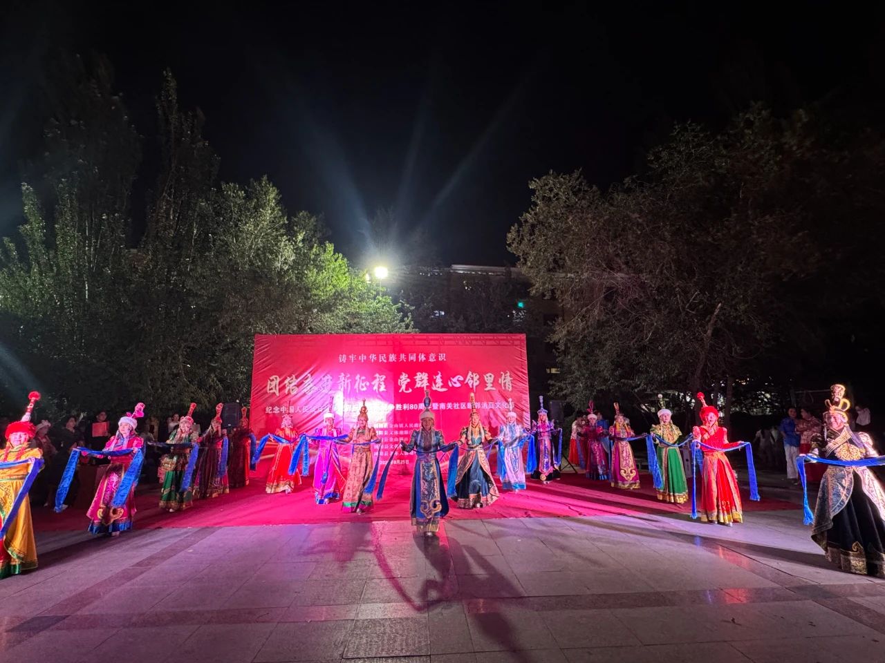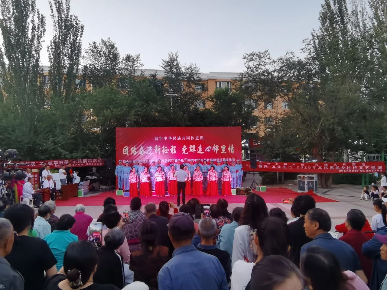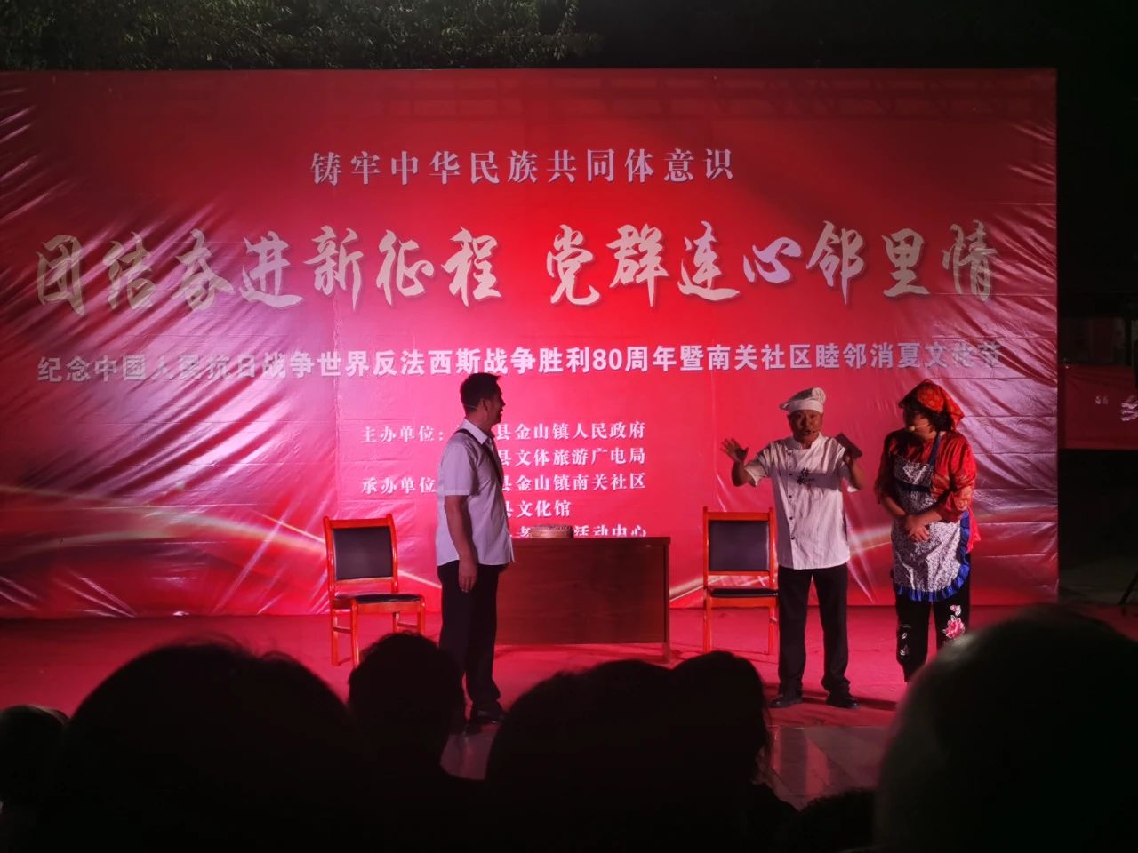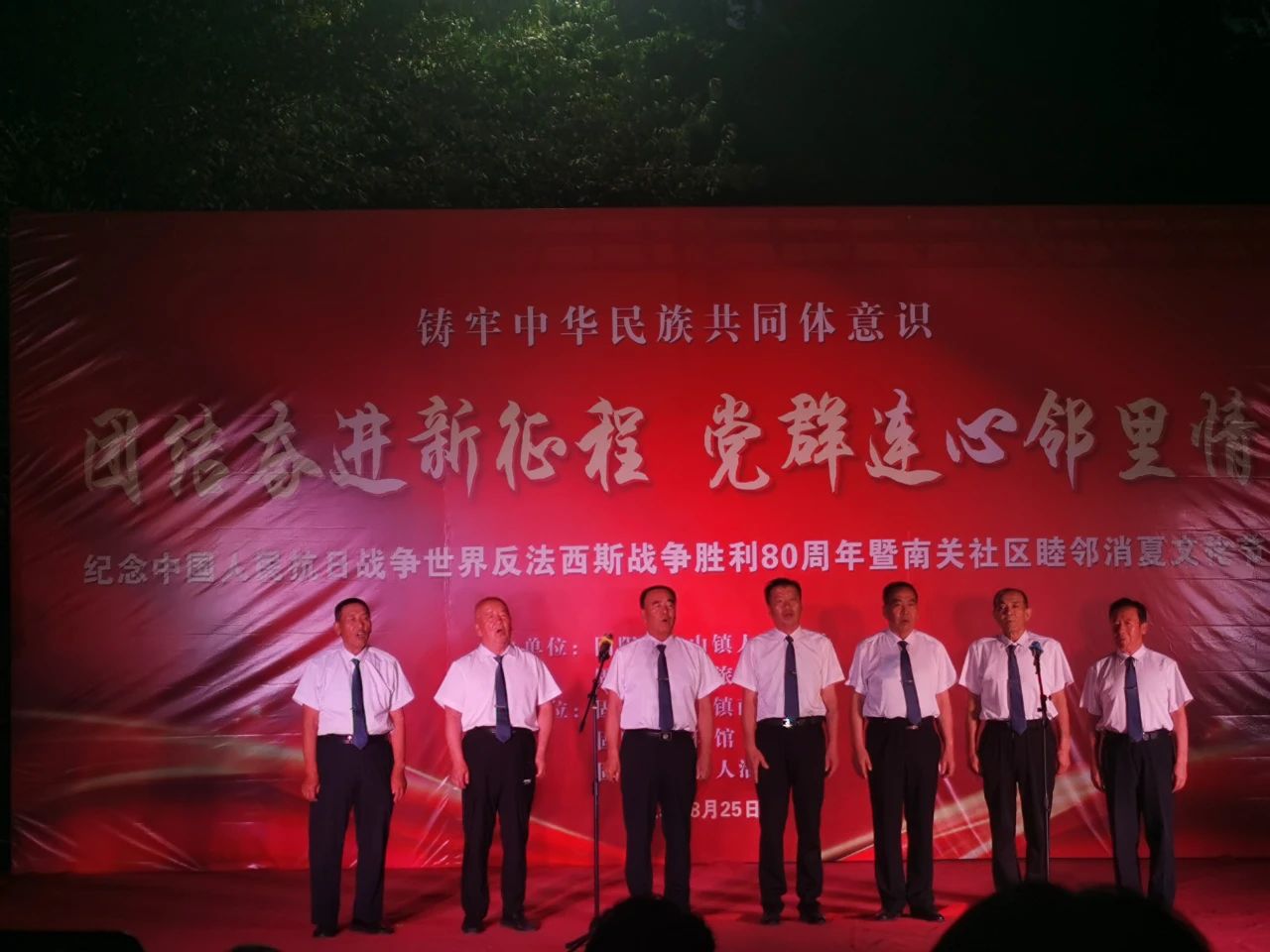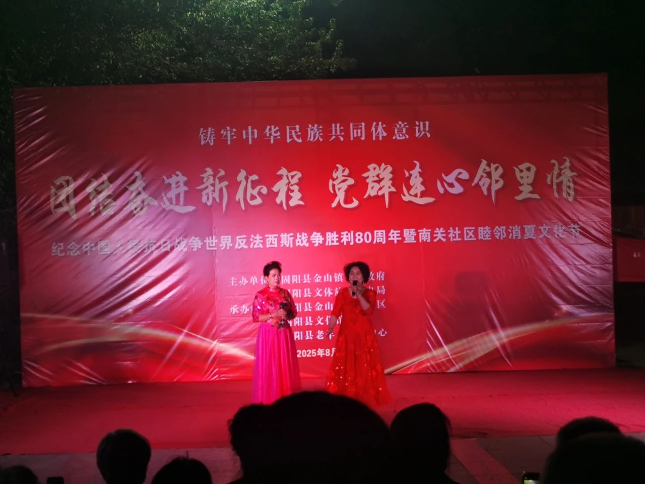 8月25日晚7点,荣泰广场人头攒动,街坊四邻已早早在此等候,由固阳县金山镇、固阳县文体旅游广电局主办,固阳县金山镇南关社区 、固阳县文化馆、固阳县老年活动中心承办的“团结奋进新征程,党群连心邻里情”纪念中国人民抗日战争世界反法西斯战争胜利80周年暨睦邻消夏文化节文艺晚会在这里热闹举行。