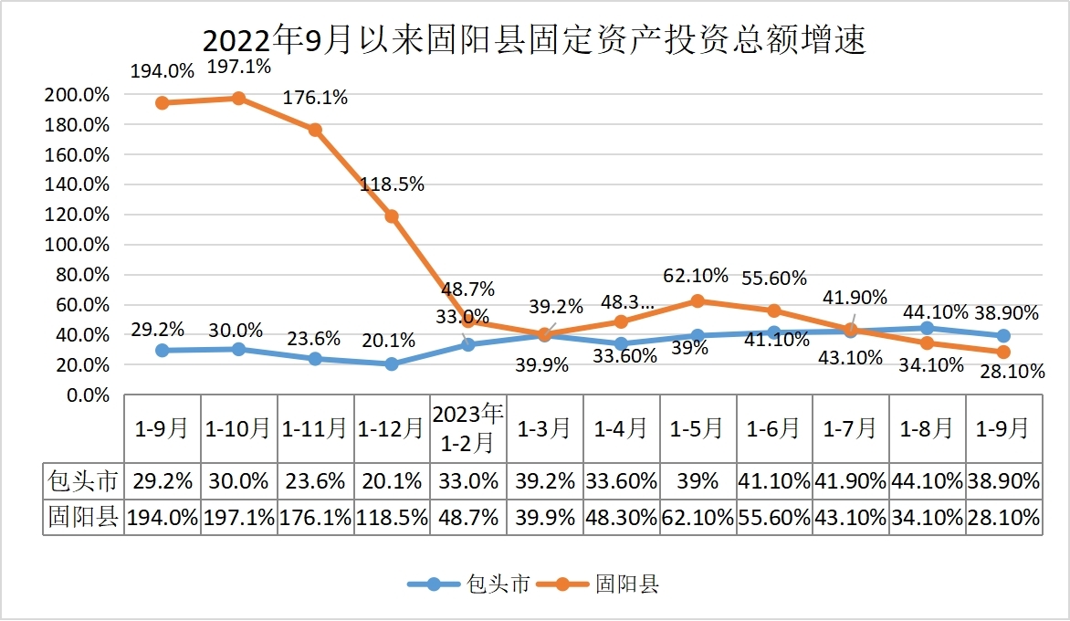 1-9月固阳县固定资产投资同比增长28.1%,增速位居全市第八,低于全市10.8个百分点。