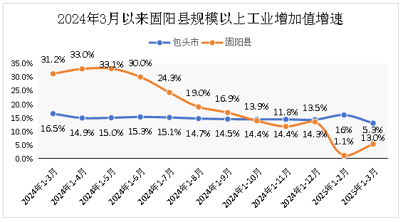 1-3月,固阳县规模以上工业增加值同比增长5.3%,低于全市平均水平7.7个百分点,增速位列全市末位,整体呈现"低位开局、承压缓增"的运行特征,主要经济指标未达预期。