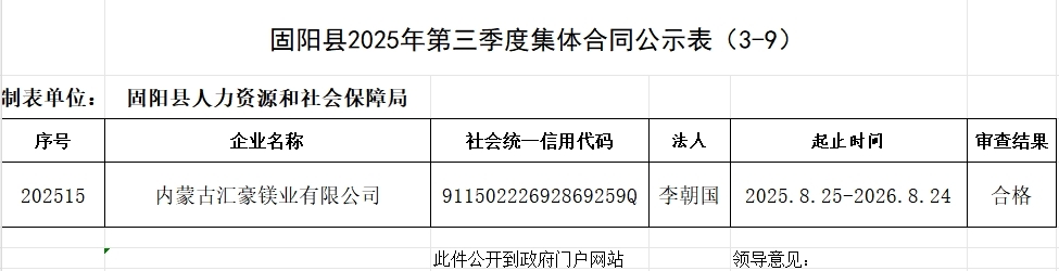 固阳县2025年第三季度集体合同公示表(3-9)