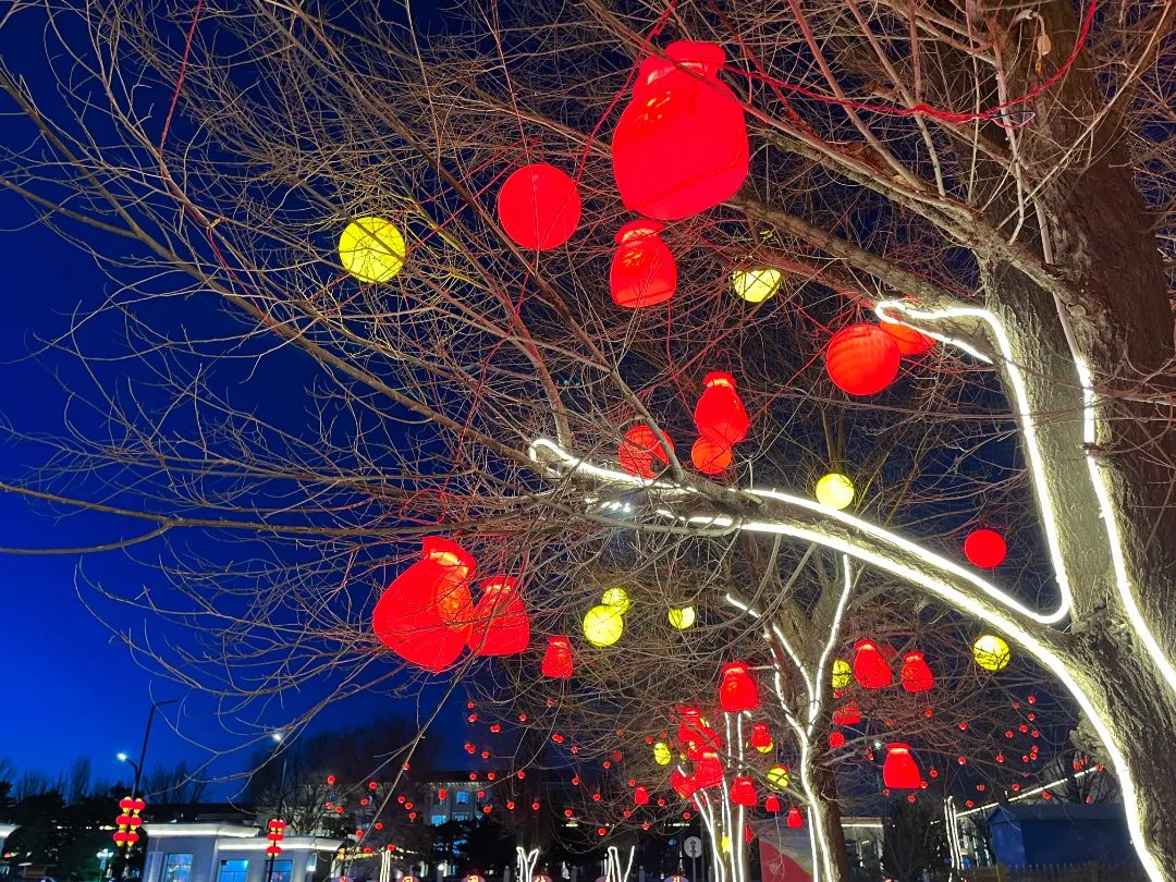 火红苹果灯和橘色柿子灯高高低低,错落有致地挂在夜空中,把温暖祥和送到每个人的心里,我仿佛又看到了小时候过年时整夜亮着的院灯,还有在睡梦中透过新糊的窗纸照到家里昏黄朦胧而又幸福的灯光。