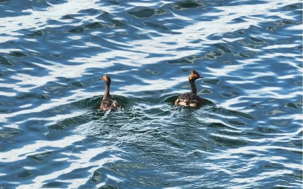 水盈泽润,也带来了更丰富的湿地生灵。许久未见的蜻蜓翩跹起舞,蟾蜍也重回故地。在同兴功湖湿地的中心岛上,数只国家二级重点保护野生动物黑颈鸊鷉从芦苇丛中探出头来,它们油亮的黑羽在晨光中泛着幽蓝的光泽,耳后一抹金黄如火焰般耀眼。目前监测数据显示,兴顺西镇北部6处湿地(包括老羊壕南滩、四份子东湖、河楞湖和同兴功湖4处市级重要湿地)内共有黑颈鸊鷉58只,其中多数已开始携幼觅食,仅有少部分个体还在孵化育雏的阶段。这是监测人员首次在此记录到黑颈鸊鷉大量繁殖的景象。同时还有赤麻鸭、翘鼻麻鸭、鹊鸭、反嘴鹬及蒙古沙鸻等24种近700只湿地鸟类在此栖息繁殖。