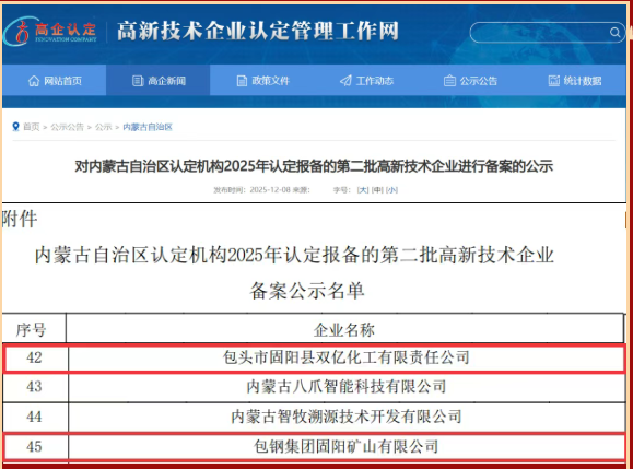 近日,全国高新技术企业认定管理工作领导小组办公室对内蒙古自治区认定机构2025年认定报备的第二批至第五批高新技术企业名单进行了备案公示。包头金山经济开发区表现突出,共有包头市固阳县双亿化工有限责任公司、包钢集团固阳矿山有限公司、内蒙古洪盛新材料有限公司、固阳县九州电力杆塔有限责任公司、内蒙古宏盛美亚科技环保设备有限公司,5家企业成功入选,标志着开发区在科技创新与企业培育方面取得重要进展。