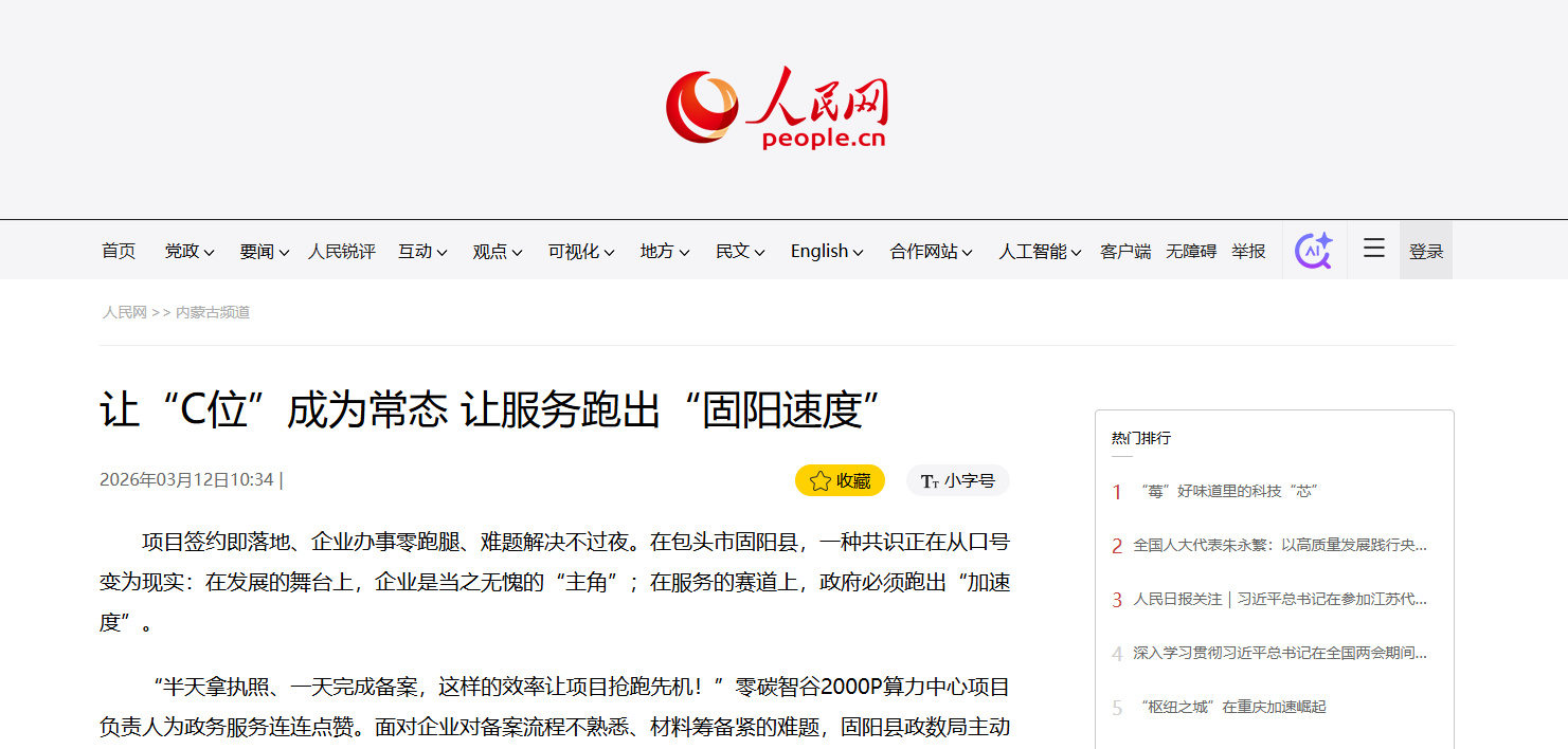 3月12日,人民网刊发《让“C位”成为常态 让服务跑出“固阳速度”》一文,聚焦固阳县优化营商环境实践,将“项目签约即落地、企业办事零跑腿、难题解决不过夜”落到实处,通过帮办代办、并联审批等举措,实现多个项目快速落地,打造企业综合服务专区优化涉企服务,以“固阳速度”和服务温度,让企业占据发展“C位”。