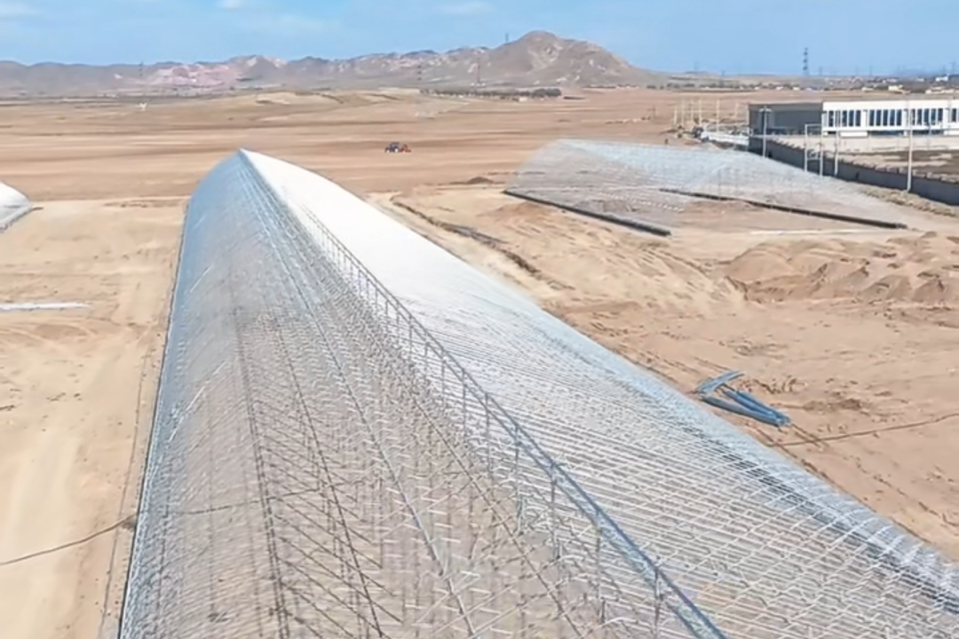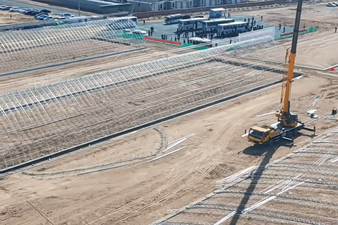 基地现场,一片热火朝天的景象映入眼帘,大型机械设备轰鸣作业,工人们在各自的岗位上紧张而有序地忙碌着。钢架焊接、轨道铺设,一座座拱棚“破土而出”,勾勒出现代农业的“科技脊梁”。