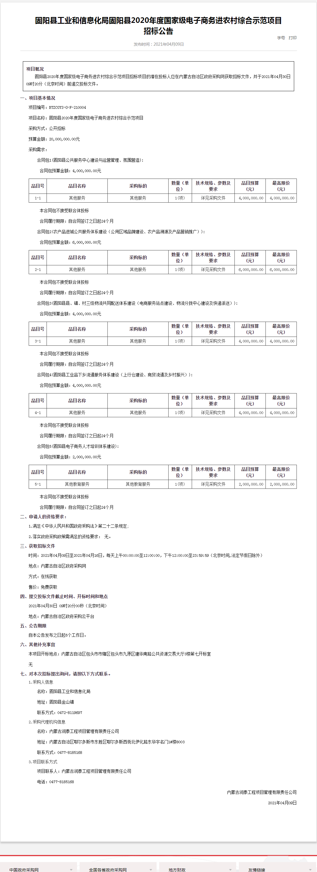 固阳县工业和信息化局固阳县2020年度国家级电子商务进农村综合示范项目招标公告