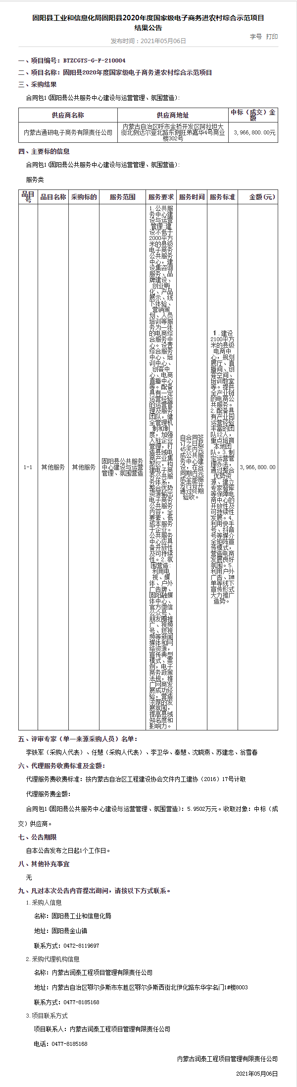 固阳县工业和信息化局固阳县2020年度国家级电子商务进农村综合示范项目结果公告