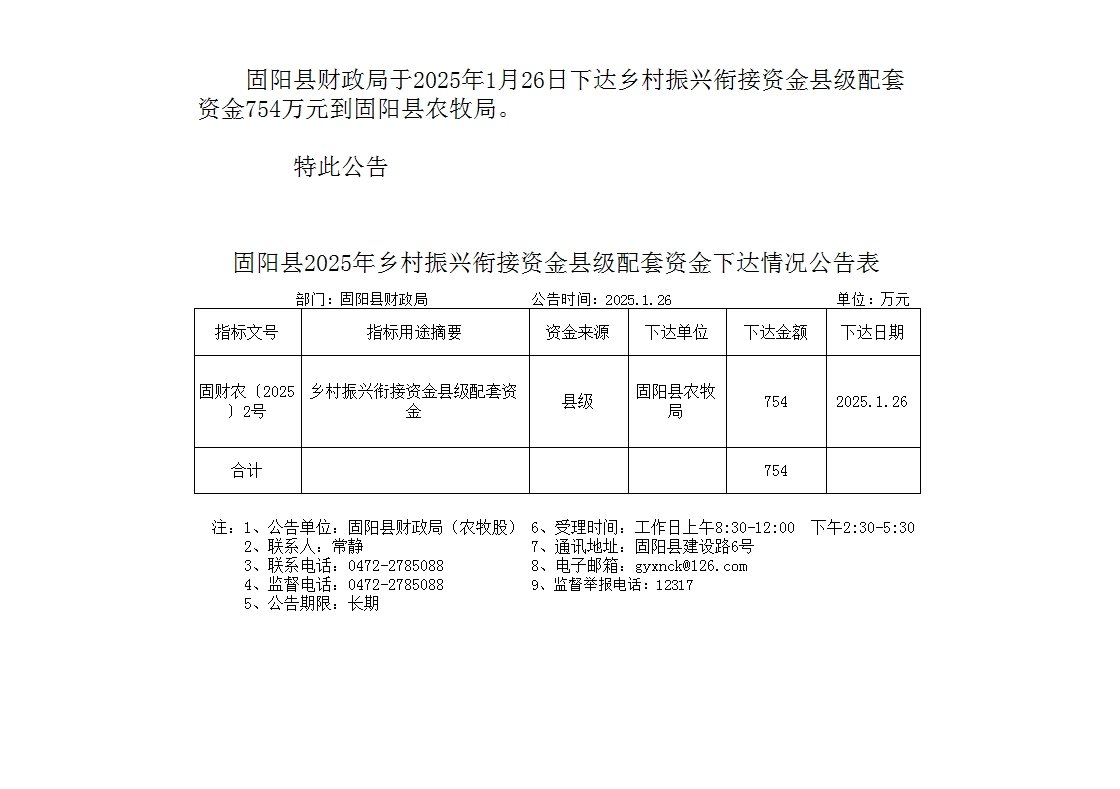 固阳县2025年乡村振兴衔接资金县级配套资金下达情况
