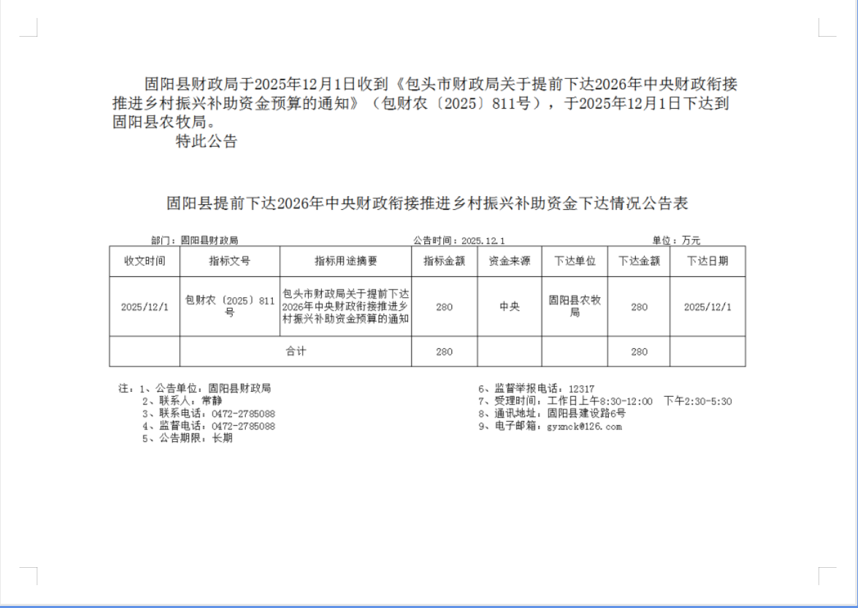 固阳县关于提前下达2026年中央财政衔接推进乡村振兴补助资金下达情况公示