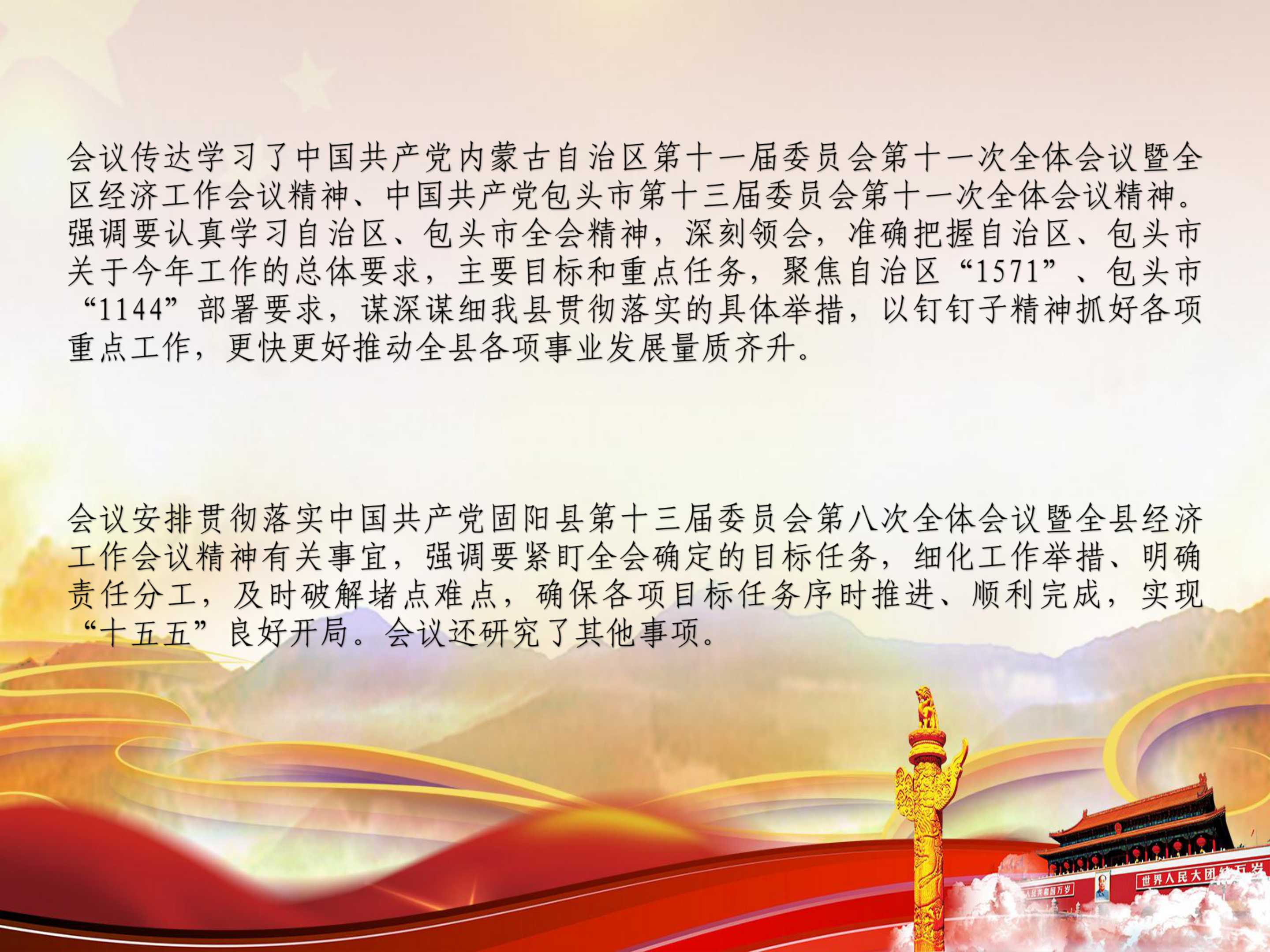 会议传达学习了中国共产党内蒙古自治区第十一届委员会第十一次全体会议暨全区经济工作会议精神、中国共产党包头市第十三届委员会第十一次全体会议精神。强调要认真学习自治区、包头市全会精神,深刻领会,准确把握自治区、包头市关于今年工作的总体要求,主要目标和重点任务,聚焦自治区“1571”、包头市“1144”部署要求,谋深谋细我县贯彻落实的具体举措,以钉钉子精神抓好各项重点工作,更快更好推动全县各项事业发展量质齐升。