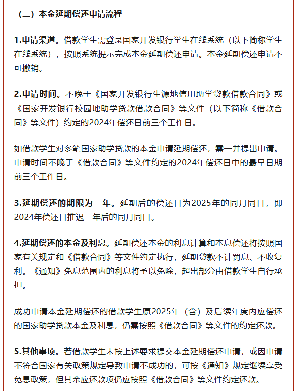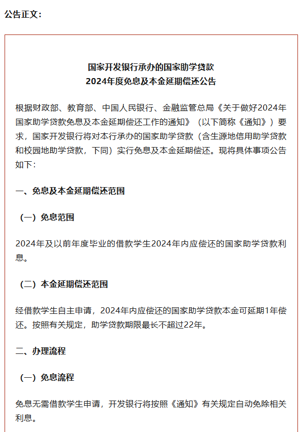 根据公告,国开行将按照《通知》有关规定自动免除2024年及以前年度毕业的贷款学生2024年内应偿还的国家助学贷款利息;经贷款学生自主申请,2024年内应偿还的国家助学贷款本金可延期1年偿还。