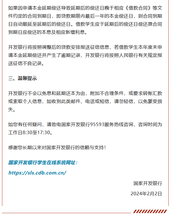 国家开发银行日前在官方网站发布公告称,根据财政部、教育部、中国人民银行、金融监督管理总局《关于做好2024年国家助学贷款免息及本金延期偿还工作的通知》(以下简称《通知》)要求,国开行将对所承办的国家助学贷款(含生源地信用助学贷款和校园地助学贷款)实行免息及本金延期偿还。这是国开行落实国家政策,自2022年以来连续第三年对所承办的国家助学贷款实行免息和本金延期偿还。
